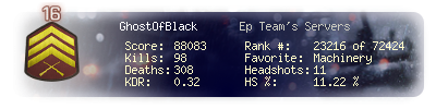 | Kills | 98 | Deaths | 308 | Kill / Death | 0.32 |