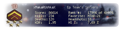| Kill-streak | 13 | Death-streak | 6 | Team Kills | 0 |