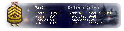 | Headshots | 204 | Suicides | 8 | Headshot / Kill | 21.47 % |