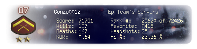 | Headshots | 25 | Suicides | 1 | Headshot / Kill | 23.36 % |