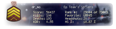 | Headshots | 20 | Suicides | 4 | Headshot / Kill | 18.87 % |