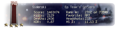 | Headshots | 308 | Suicides | 64 | Headshot / Kill | 11.74 % |