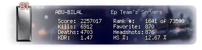 | Headshots | 1173 | Suicides | 91 | Headshot / Kill | 12.94 % |