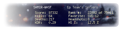 | Headshots | 8 | Suicides | 3 | Headshot / Kill | 12.5 % |