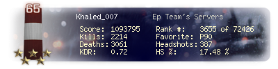 | Headshots | 388 | Suicides | 65 | Headshot / Kill | 17.48 % |