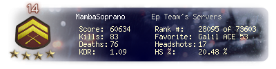 | Headshots | 17 | Suicides | 0 | Headshot / Kill | 20.48 % |