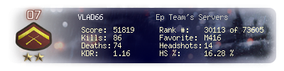 | Headshots | 14 | Suicides | 0 | Headshot / Kill | 16.28 % |