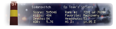| Headshots | 70 | Suicides | 3 | Headshot / Kill | 9.23 % |