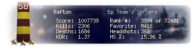 | Headshots | 368 | Suicides | 20 | Headshot / Kill | 15.96 % |