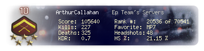 | Headshots | 48 | Suicides | 4 | Headshot / Kill | 21.15 % |