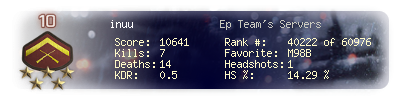 | Headshots | 1 | Suicides | 0 | Headshot / Kill | 14.29 % |