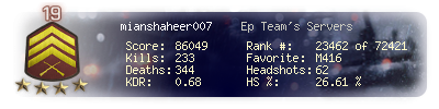 | Headshots | 62 | Suicides | 6 | Headshot / Kill | 26.61 % |