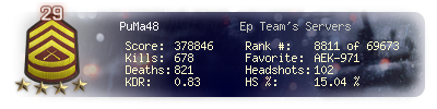| Headshots | 85 | Suicides | 10 | Headshot / Kill | 13.89 % |