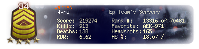 | Headshots | 165 | Suicides | 2 | Headshot / Kill | 18.07 % |