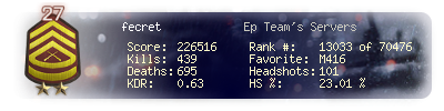 | Headshots | 158 | Suicides | 19 | Headshot / Kill | 21.09 % |