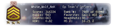 | Headshots | 88 | Suicides | 6 | Headshot / Kill | 16.21 % |