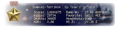 | Kills | 29734 | Deaths | 34665 | Kill / Death | 0.86 |