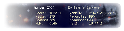 | Headshots | 33 | Suicides | 14 | Headshot / Kill | 18.44 % |