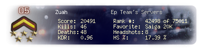 | Headshots | 8 | Suicides | 1 | Headshot / Kill | 17.39 % |