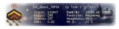 | Headshots | 106 | Suicides | 42 | Headshot / Kill | 16.54 % |