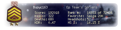 | Kill-streak | 5 | Death-streak | 19 | Team Kills | 0 |