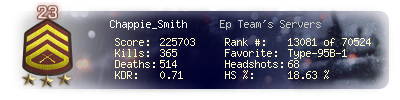 | Headshots | 68 | Suicides | 20 | Headshot / Kill | 18.63 % |