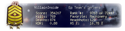 | Headshots | 129 | Suicides | 19 | Headshot / Kill | 16.78 % |