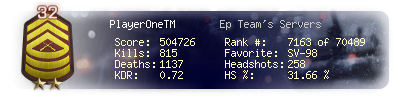 | Headshots | 207 | Suicides | 7 | Headshot / Kill | 29.78 % |