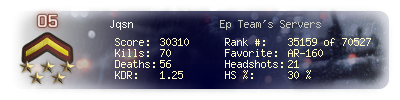 | Headshots | 21 | Suicides | 5 | Headshot / Kill | 30 % |