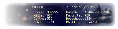 | Headshots | 151 | Suicides | 5 | Headshot / Kill | 20.13 % |