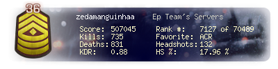 | Headshots | 132 | Suicides | 6 | Headshot / Kill | 17.96 % |