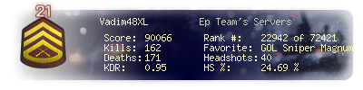 | Headshots | 40 | Suicides | 2 | Headshot / Kill | 24.69 % |
