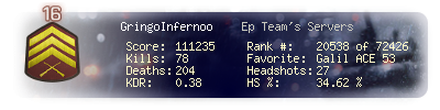| Headshots | 30 | Suicides | 8 | Headshot / Kill | 27.03 % |