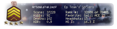 | Headshots | 15 | Suicides | 5 | Headshot / Kill | 16.3 % |
