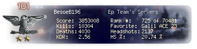 | Kills | 17033 | Deaths | 6480 | Kill / Death | 2.63 |