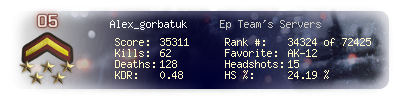 | Headshots | 15 | Suicides | 3 | Headshot / Kill | 24.19 % |