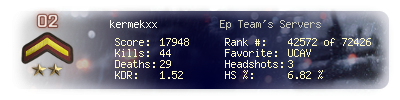 | Headshots | 3 | Suicides | 1 | Headshot / Kill | 6.82 % |