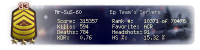 | Headshots | 492 | Suicides | 102 | Headshot / Kill | 13.2 % |