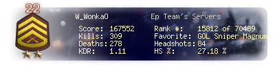 | Headshots | 84 | Suicides | 3 | Headshot / Kill | 27.18 % |