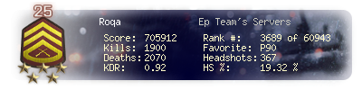 | Headshots | 367 | Suicides | 89 | Headshot / Kill | 19.46 % |
