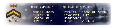 | Headshots | 10 | Suicides | 1 | Headshot / Kill | 26.32 % |