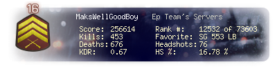 | Headshots | 76 | Suicides | 6 | Headshot / Kill | 16.78 % |