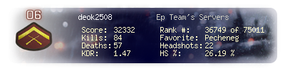 | Headshots | 22 | Suicides | 2 | Headshot / Kill | 26.19 % |