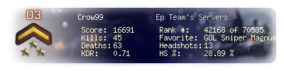 | Headshots | 13 | Suicides | 1 | Headshot / Kill | 28.89 % |