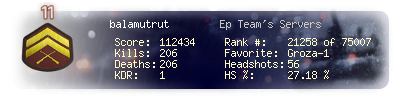 | Headshots | 56 | Suicides | 6 | Headshot / Kill | 27.18 % |