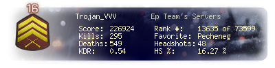 | Headshots | 48 | Suicides | 7 | Headshot / Kill | 16.27 % |