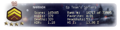 | Headshots | 53 | Suicides | 3 | Headshot / Kill | 13.98 % |