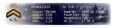 | Headshots | 172 | Suicides | 7 | Headshot / Kill | 18.22 % |