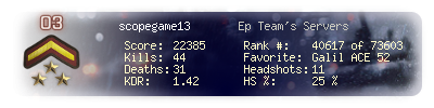 | Headshots | 11 | Suicides | 0 | Headshot / Kill | 25 % |