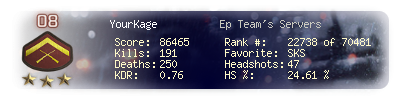 | Kills | 191 | Deaths | 250 | Kill / Death | 0.76 |
